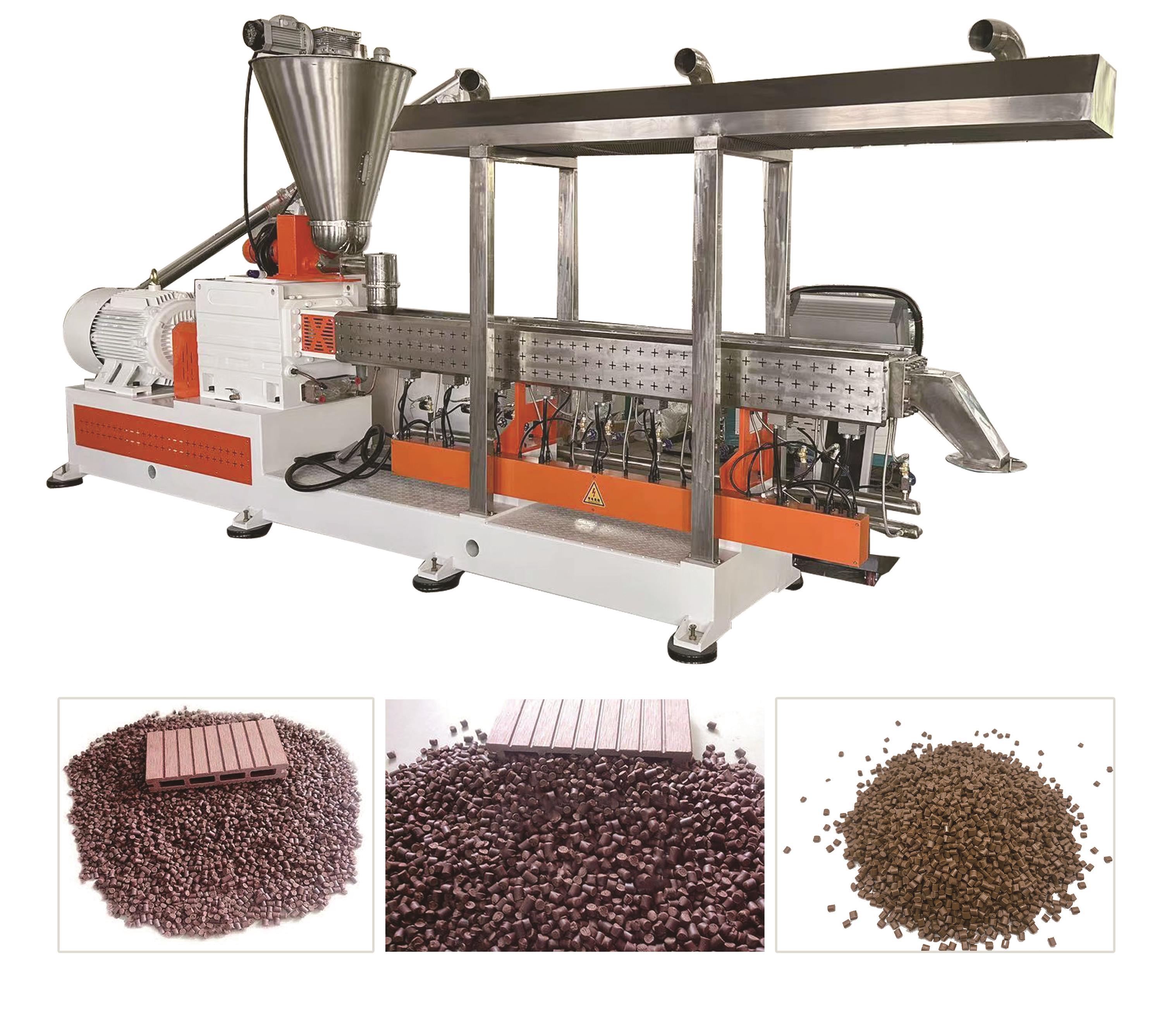 分融合。所有原材料經(jīng)造粒機加工制成顆粒后,再經(jīng)木塑型材生產(chǎn)線加工出木塑型材。